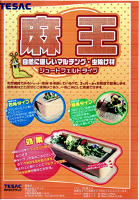 シート状、マット状、ひも状のジュート麻や木綿や生分解性素材の農業資材類にキトエースを所定量含有させたものをここでは「減農薬化農業資材」と呼んでいます。これらの資材は、野菜や果物や緑化樹木や花卉類を植栽した圃場や田畑の畝面に直接、帯状に敷設するか、被覆して使用します。この資材を使うことで、野菜や花を食べる害虫類(人間にとっては害虫)を寄せ付けない(忌避する)ことができます。このキトエース処理資材には殺虫性はなく、忌避効果だけによって、これらの害虫から大切な野菜や果実や花を護っているのが最大の特長です。しかも、キトエース自体は非常に安全です。減農薬化農業資材を農業に使うことで、通常の農薬を使わずに野菜や花卉、蔬菜の栽培ができます。
